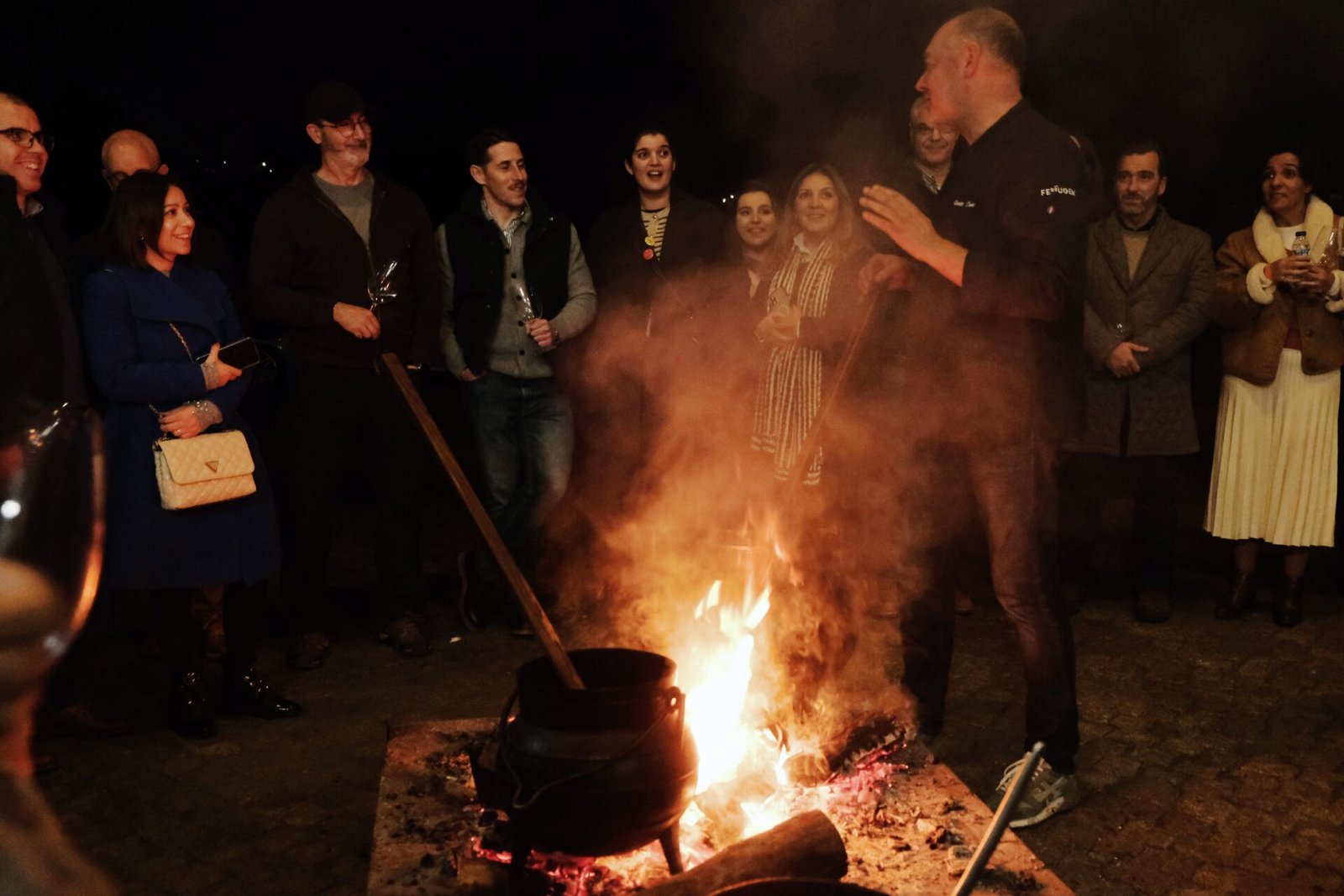 Um dos momentos mais memoráveis foi quando nos juntámos em volta da fogueira com o chef Renato Cunha, que partilhou a receita do leite creme com farinha de boleto. O público participou ativamente, mexendo o creme nas panelas de ferro, sentindo o aroma fumado e a textura a desenvolver-se. Foi um instante de partilha, aprendizagem e conexão com a gastronomia da região do Dão.